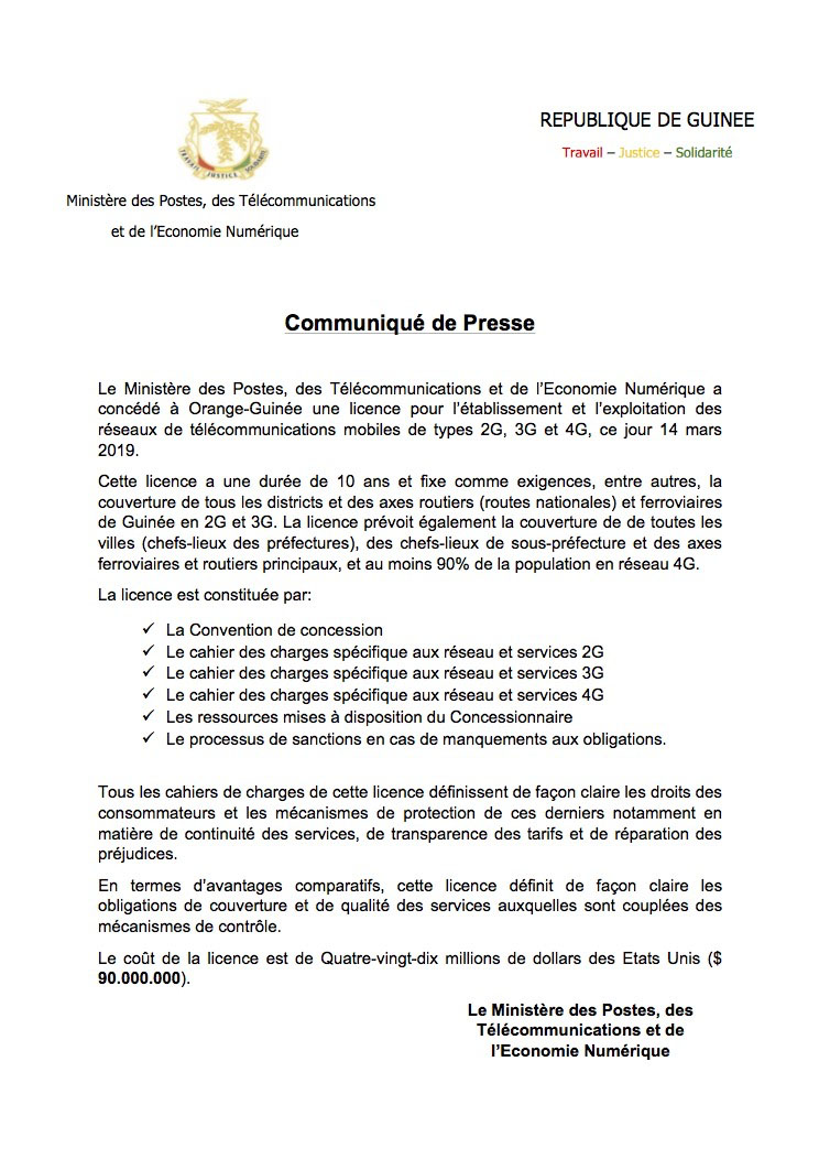Le ministre des postes, Télécommunications et de l’économie numérique Moustapha Mamy Diaby a procédé ce jeudi 14 mars 2019 à la signature de la convention de Licence pour l’établissement et l’exploitation des réseaux de télécommunications mobiles 2G, 3G et 4G avec l’opérateur Orange-Guinée.